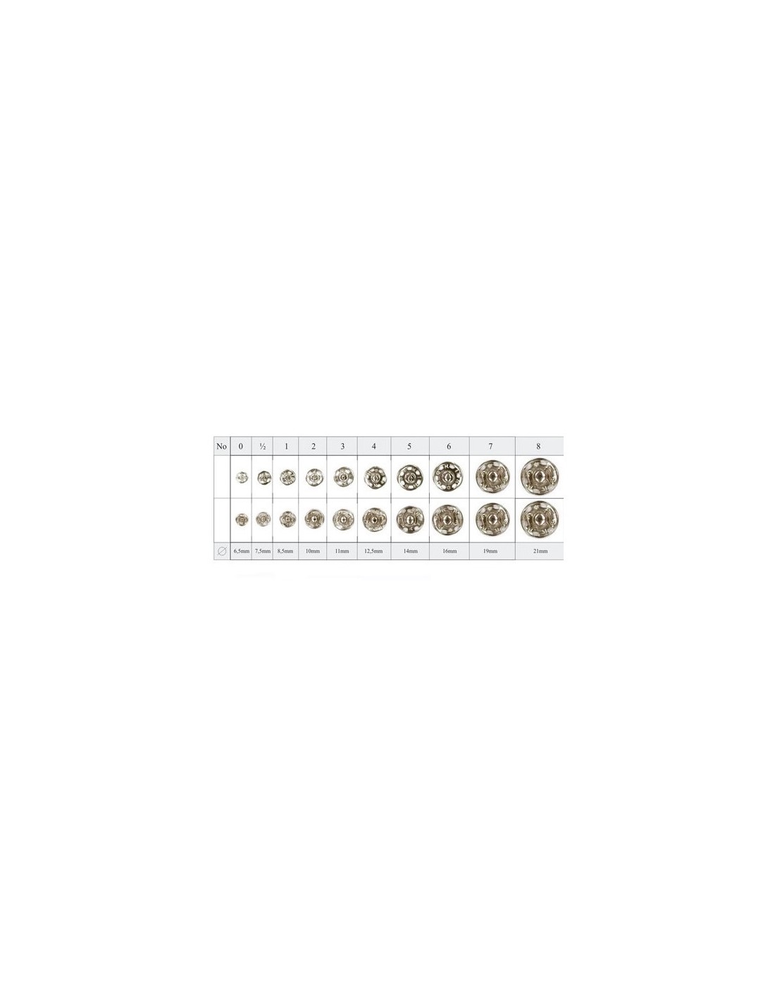 Broche clásico en costura con 2 colores disponibles, metal ó negro y 10 tamaños diferentes.